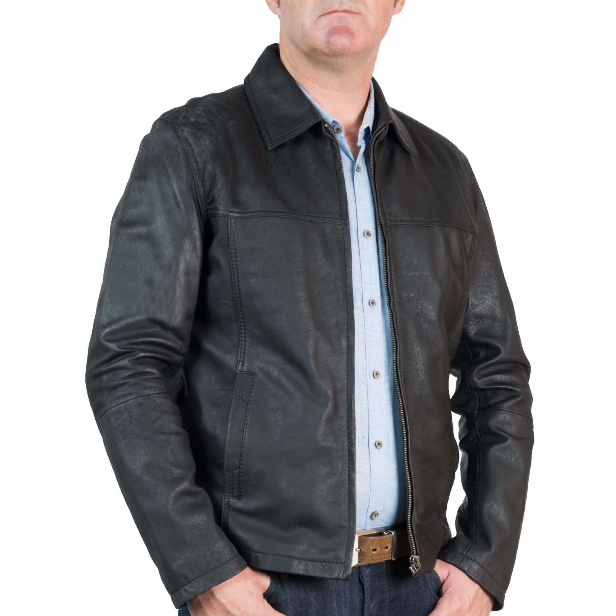 • A minimalist men’s classic zip leather jacket crafted in a black soft leather that has been lightly milled for a subtle vintage finish.